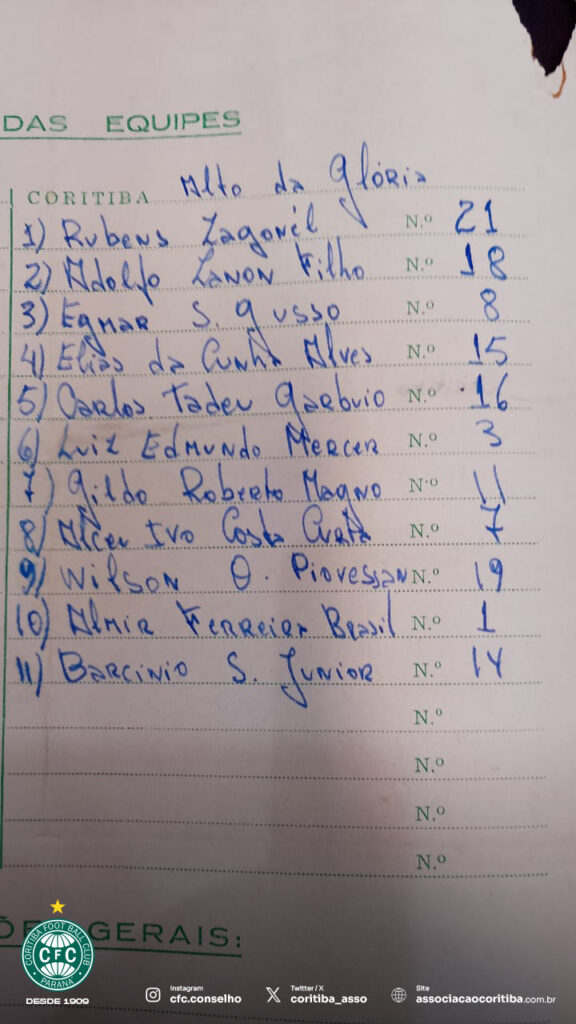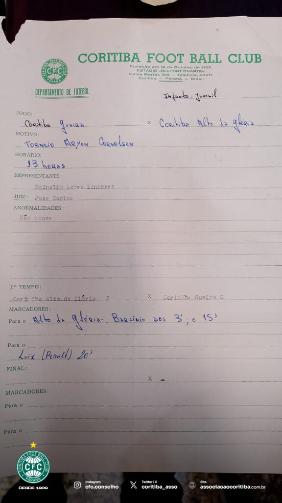 O dia em que Sicupira marcou dois gols jogando pelo Coritiba: conheça mais desta partida do infantojuvenil, pelo Torneio Aryon Cornelsen, uma competição em homenagem a um dos maiores presidentes da história do Clube. Foi Aryon, na presidência do Alviverde, quem assinou a ficha de sócio atleta de Sicupira, em 05/11/1956.