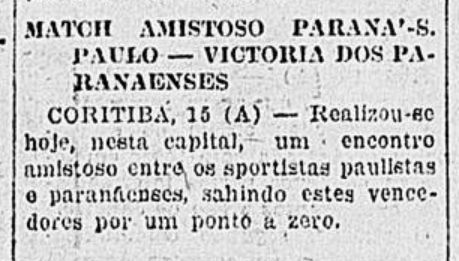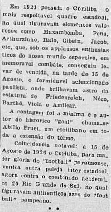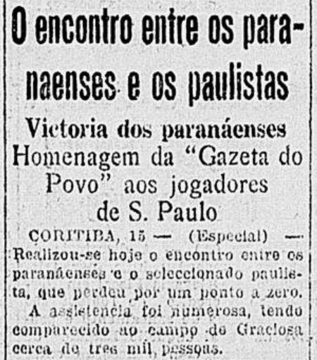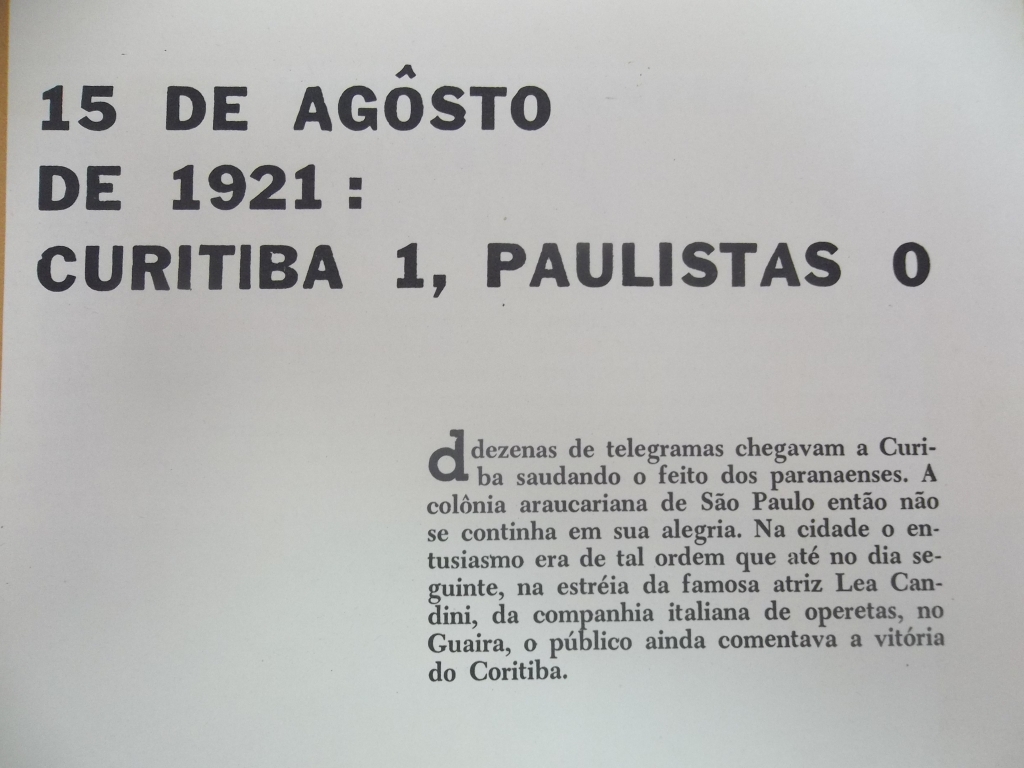 O dia 15/08/1921 registra um marco na história do futebol paranaense. Isso porque, naquele dia, o Coritiba conseguiu o que, até então era, para muitos algo impossível: um time paranaense vencer a Seleção Paulista em uma partida de futebol. Isso porque naquele selecionado havia atletas que também representavam o Brasil em jogos de futebol.